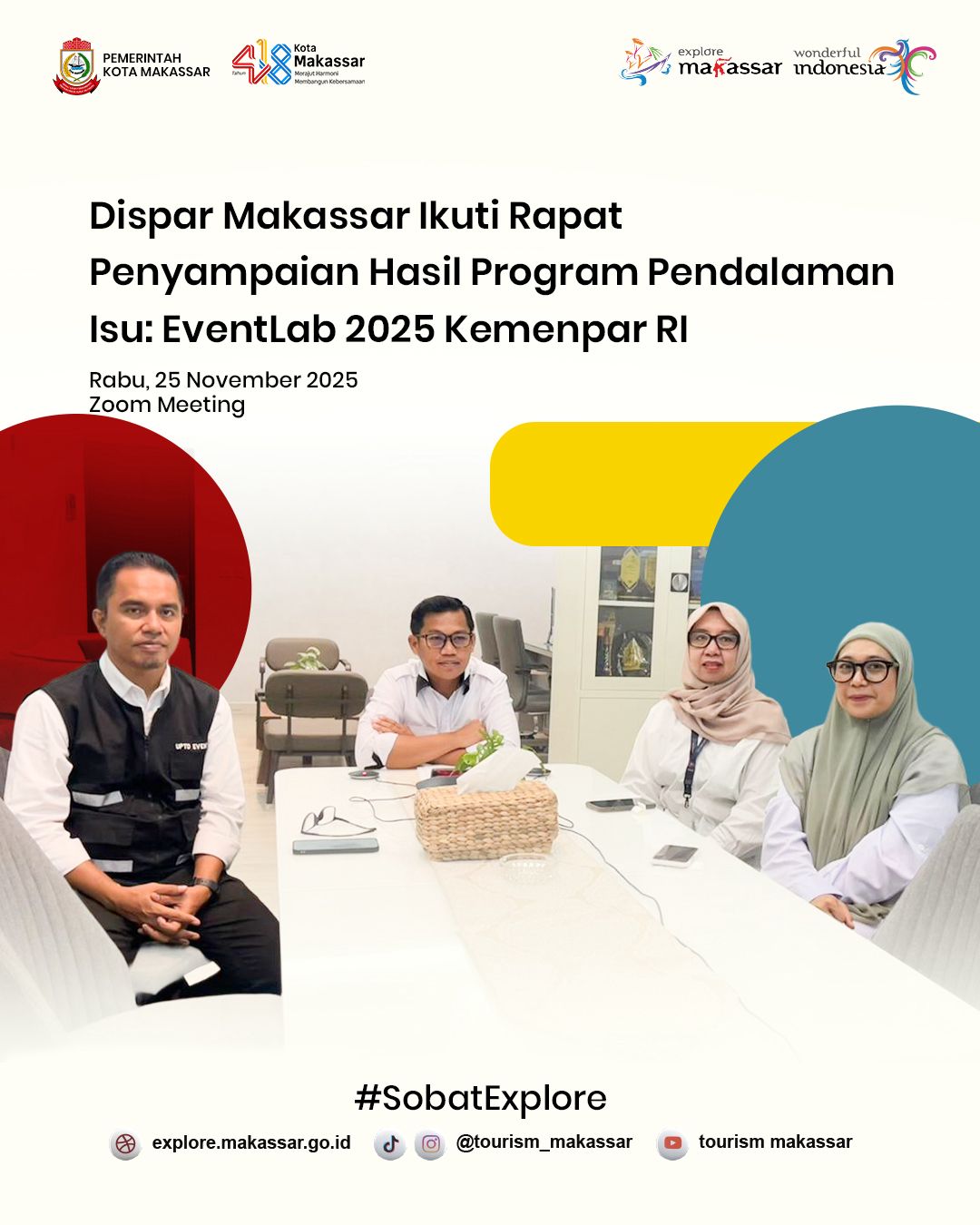 MAKASSAR.DAULATRAKYAT.Dinas Pariwisata (Dispar) Kota Makassar mengikuti Rapat Penyampaian Hasil Pelaksanaan Program Pendalaman Isu: EventLab Tahun 2025 yang diselenggarakan oleh Kementerian Pariwisata dan Ekonomi Kreatif Republik Indonesia melalui Deputi Bidang Pengembangan Penyelenggara Kegiatan (Events), Rabu (26/11/2025).